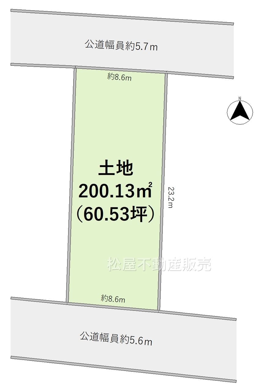 | 接道状況 | 北5.7m 公道 接面8.6m 南5.6m 公道 接面8.6m 二方道路(除角地) | ||