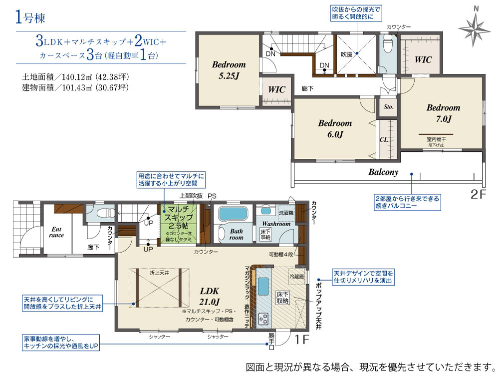 ■長期優良住宅 ■省エネ住宅BELS評価取得 ■全室南向き3LDK ■マルチスキップ2.5帖 ■日当りと風通し良好な角地 ■明るく開放感のある吹抜け ■会話増えるリビング階段 ■広々南向きバルコニー