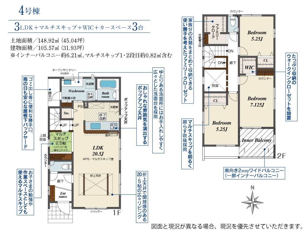 | 備考・制限等 | 建物面積:105.57平米(インナーバルコニー:約6.21平米、マルチスキップ1・2段目:0.82平米含む) | ||