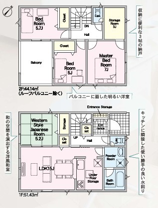 ■耐震 + 制震の家、QUIE(クワイエ)■4LDK■リビング隣接和室■便利な対面キッチン■主寝室に3帖の大型収納スペース付■2部屋からアクセスできる広いインナーバルコニー■家事動線良好■並列駐車2台