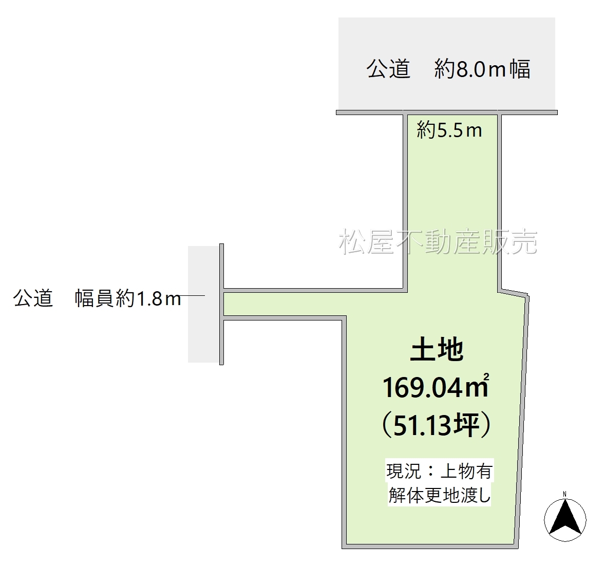 | 接道状況 | 北8m 公道 接面5.5m 西1.8m 公道 二方道路(除角地) | ||