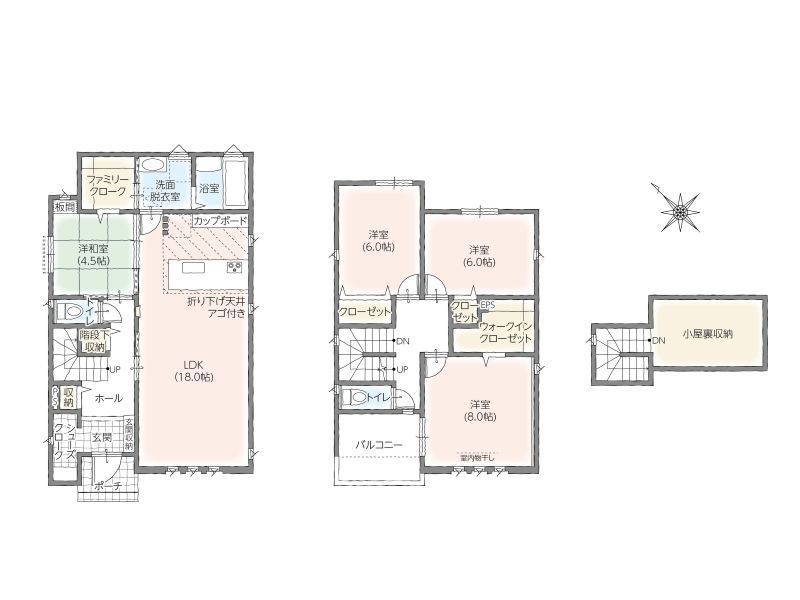■安心の長期優良住宅 ■小屋根収納付き【4LDK】■オール電化 ■ファミリークロークとしても利用可能な1階和室収納 ■開放感のある天井高2.7メートル(1階)■水回り家事ラク動線の間取