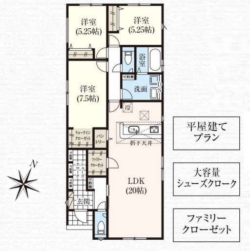 ■断熱性・気密性・換気性に優れた「ZEH水準」■耐震性に優れたI.D.S工法 ■平屋建て住宅 ■収納充実「3LDK」 ■広々南向きリビング20帖 ■大容量シューズクローク ■ファミリークローク完備