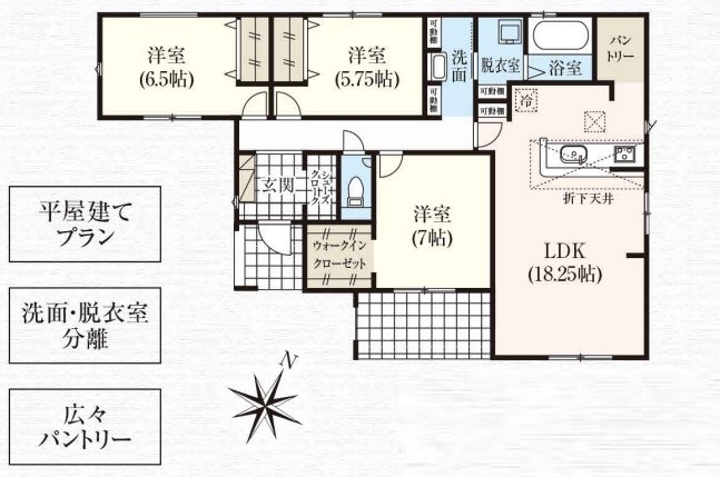 ■平屋建て住宅「3LDK」 ■生活動線良好な間取り ■南向きリビング18.25帖 ■全居室収納完備 ■広々パントリー ■シューズクローク ■断熱性・気密性・換気性に優れた「ZEH水準」