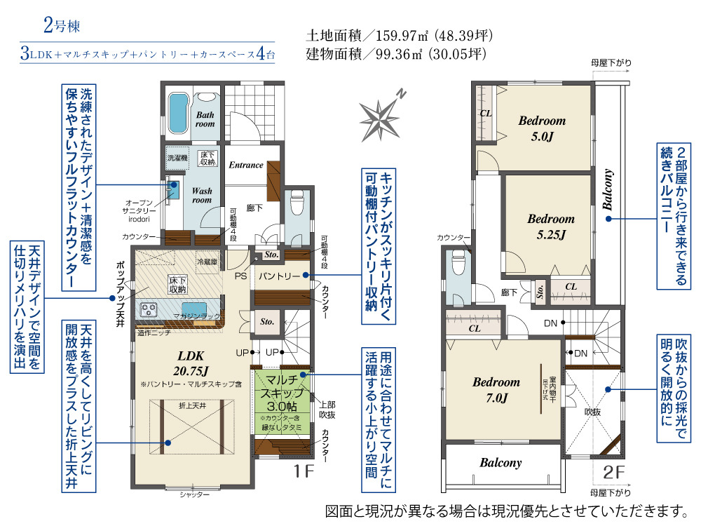 ■長期優良住宅 ■【3LDK】■大容量の可動棚付きパントリー ■LDK隣接マルチスキップ3帖 ■リビング階段 ■バルコニー2カ所 ■室内物干し完備 ■LDK折り上げ天井 ■省エネ住宅BELS評価取得