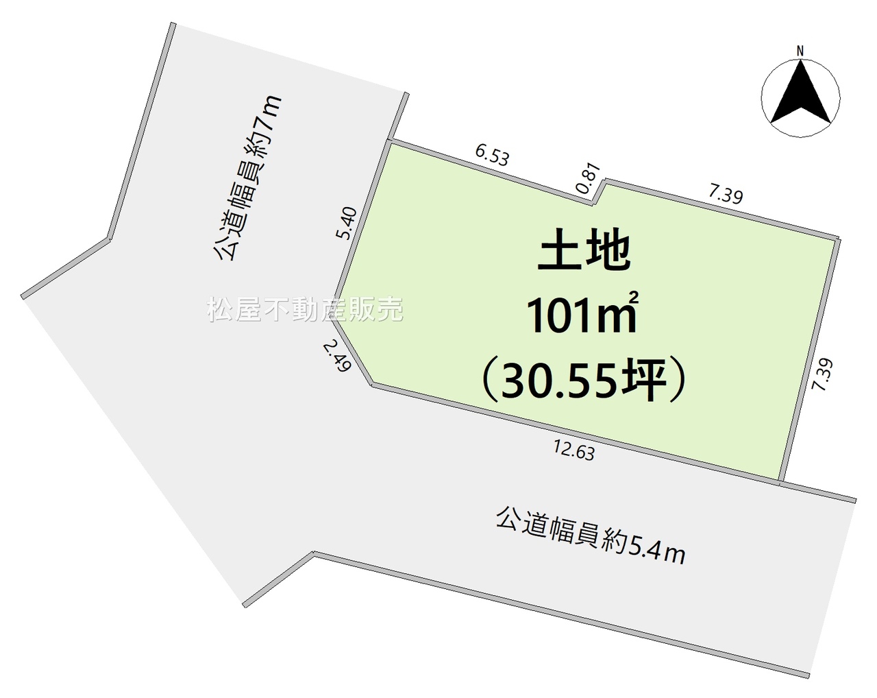 | 接道状況 | 南5.4m 公道 接面12.6m 西7.1m 公道 接面5.4m 角地 | ||